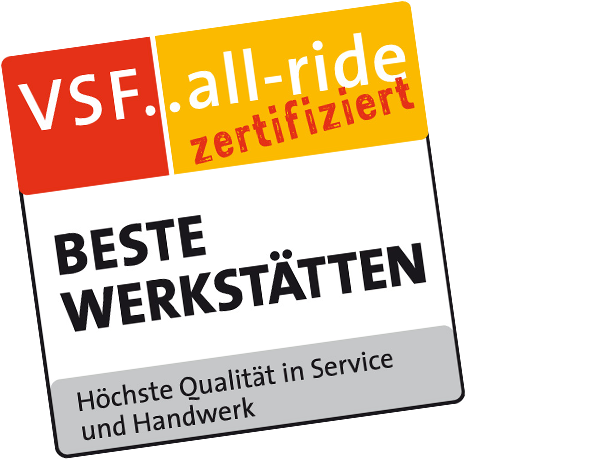 Der VSF zertifiziert Fahrrad-Werkstätten mit dem all-ride Qualitätssiegel, die nach einem ausgeklügelten, normierten Organisationssystem arbeiten und sich stets weiterentwickeln. Eine gleichbleibend hohe Werkstattqualität, Transparenz und ein verbindlicher Leistungsrahmen gegenüber dem Kunden stellen die Voraussetzungen für eine erfolgreiche Auszeichnung.