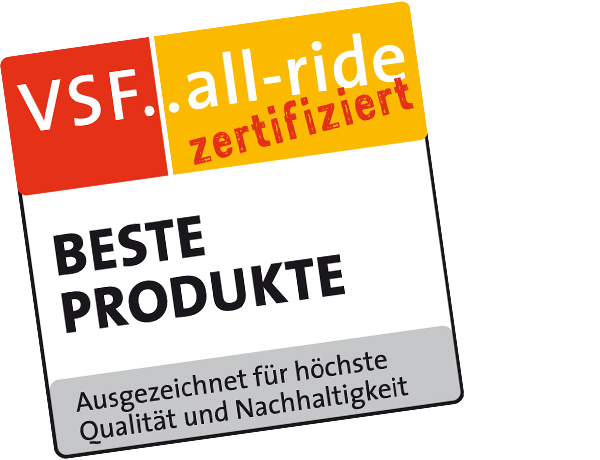 Das VSF all-ride Qualitätssiegel zeichnet besonders langlebige Fahrradkomponenten und zuverlässiges Zubehör aus. Nur Produkte, die die VSF-Expert:innen durch höchste Funktionalität, Qualität und im Idealfall umfassend nachhaltige Herstellung überzeugt haben, erhalten diese Auszeichnung.